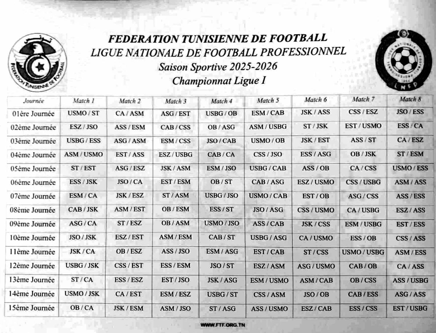 Der tunesische Fußballverband (FTF) hat am Donnerstag den offiziellen Spielplan für die Saison 2025/2026 bekannt gegeben, der die Starttermine der verschiedenen nationalen Wettbewerbe wie der Ligue 1 und Ligue 2 sowie die Teilnahme tunesischer Vereine an den von der Confédération Africaine de Football (CAF) organisierten afrikanischen Wettbewerben enthält.